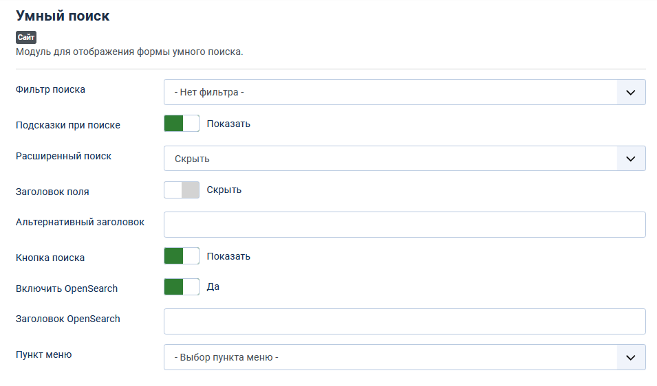 1Для создания модуля перейдите по следующим пунктам: Контент --> Модули сайта --> Создать --> Умный поиск (Модуль для отображения формы умного поиска)