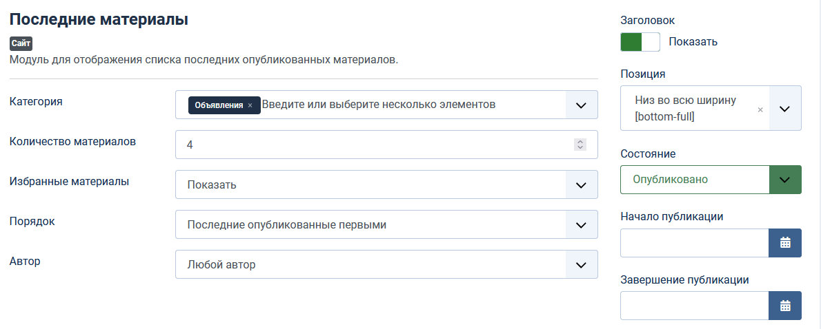 Данный модуль является переопределением стандартного модуля Joomla Последние материалы. Модуль выводит список последних добавленных материалов из одной или нескольких категорий. В макет добавлены возможность вывода даты публикации материала и вводного текста. Длина вводного текста ограничена 200 символами.